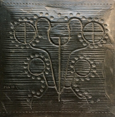 Empreinte 03 (losange et sceau) (2000) béton polyphosphate, pigments, encres et verni sur bois. 45 x 45. Expos : BUDAPEST 2000 |